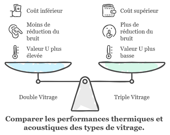 Comparer les performances thermiques et phoniques des fenêtres double vitrage et triple vitrage est essentiel pour faire un choix éclairé. Les factors solaires, les coefficients de transmission thermique (U) et les niveaux de réduction sonore sont des critères clés pour cette évaluation.